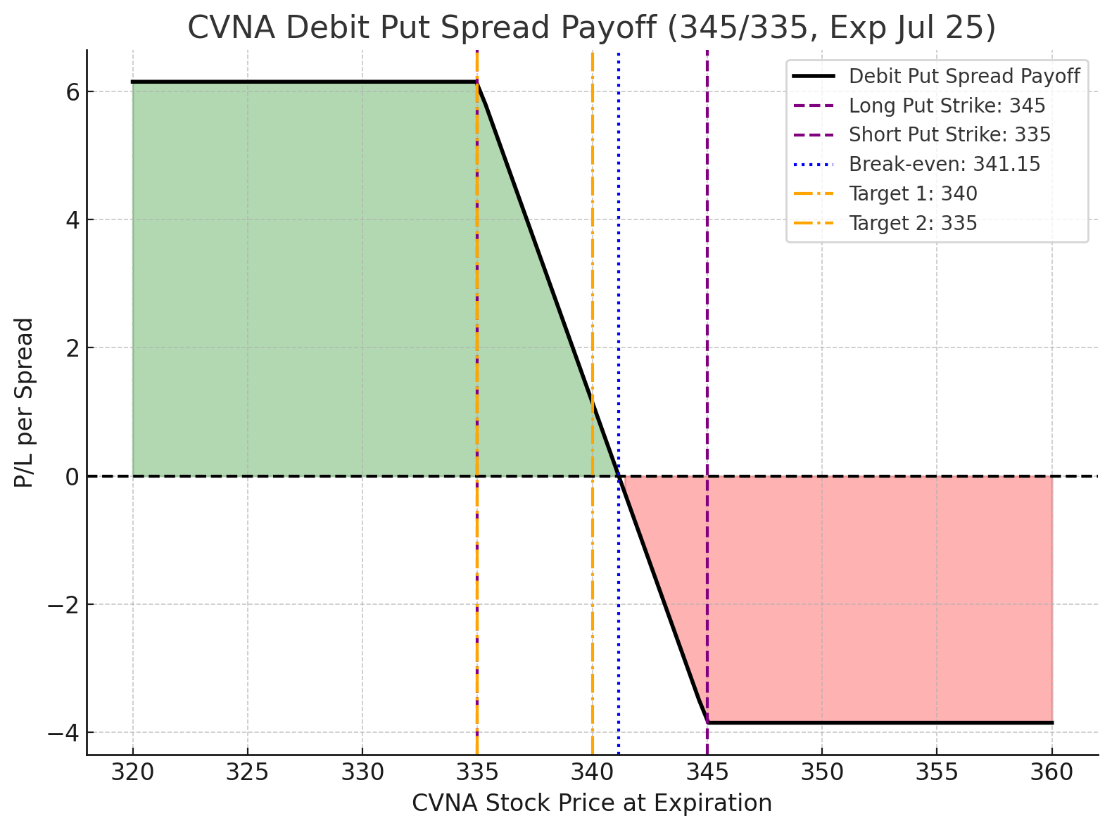 We like a defined-risk bearish setup on CVNA (Carvana Co.), using a debit put spread to position for potential short-term downside with limited risk.