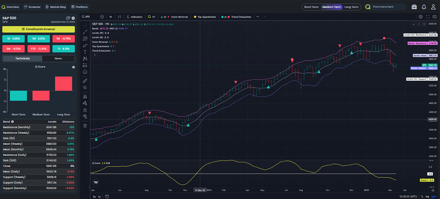 After four weeks of red, US equities finally found a footing last week — helped by a cluster of short-term positive signals flagged by Quantmatix around St. Patrick’s Day. But don’t let the bounce fool you: weekly score trends remain negative, and the medium-term view for US indices hasn’t shifted.