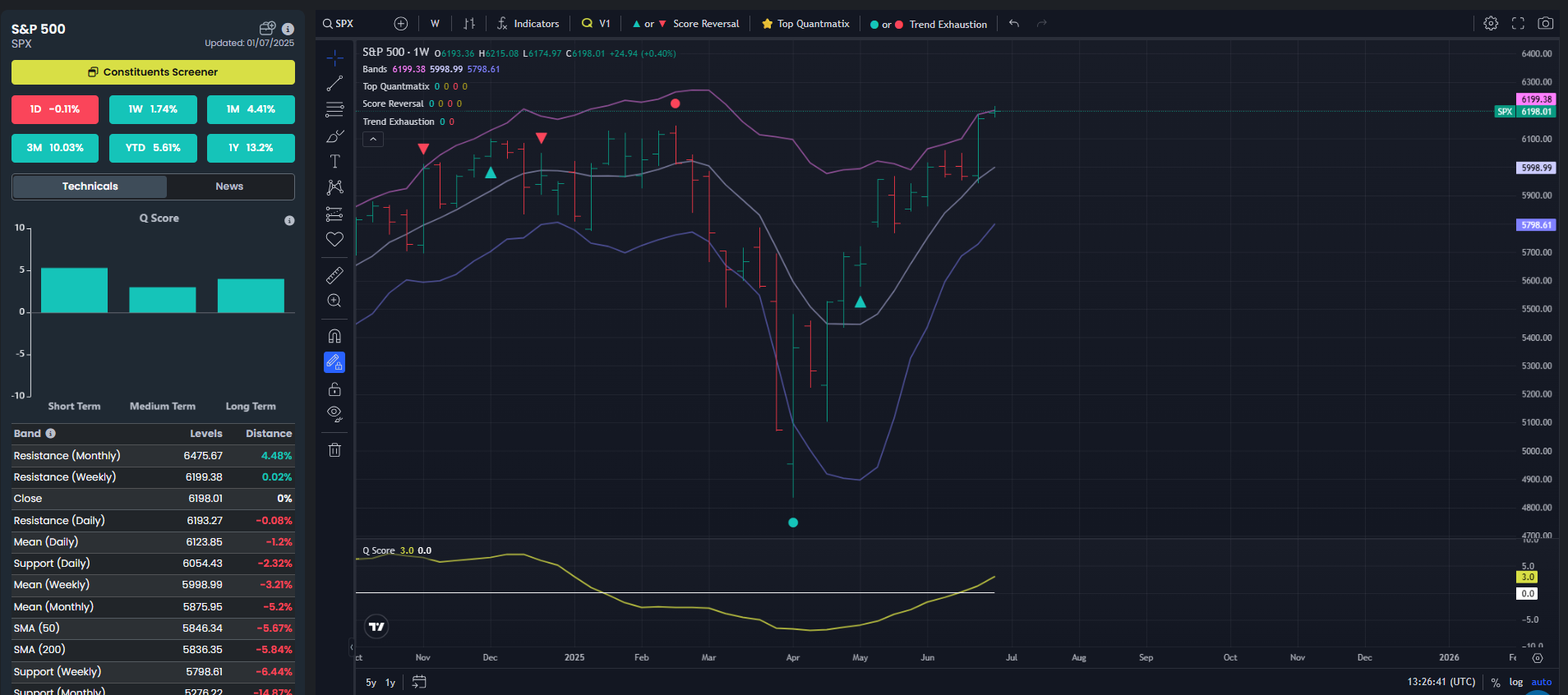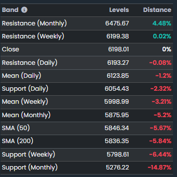 The index closed at 6198.01, just 0.02% below weekly resistance (6199.38) and slightly above daily resistance (6193.27). This suggests the market is pushing into key resistance levels π§±, testing the upper edge of recent ranges.